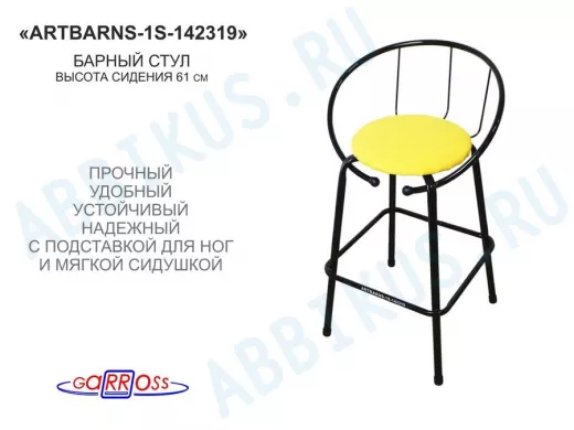 Барный стул "ARTBARNS-1S" органично дополнит интерьер модного заведения или домашней кухни. Стильная модель высотой 0,61 метра устойчиво стоит на четырех опорах с удобными подножками.