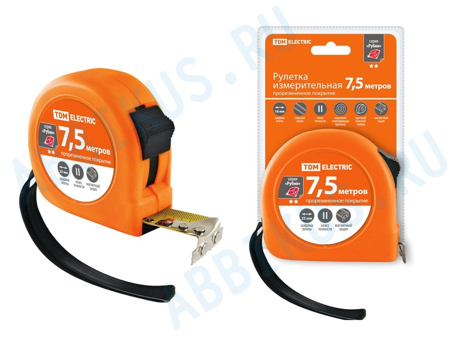 В корзину Купить в 1 клик Рулетка TDM 7,5 м, стальная лента, ширина 25 мм, прорезиненное покрытие, магнит, "Рубин" SQ1018-0107
