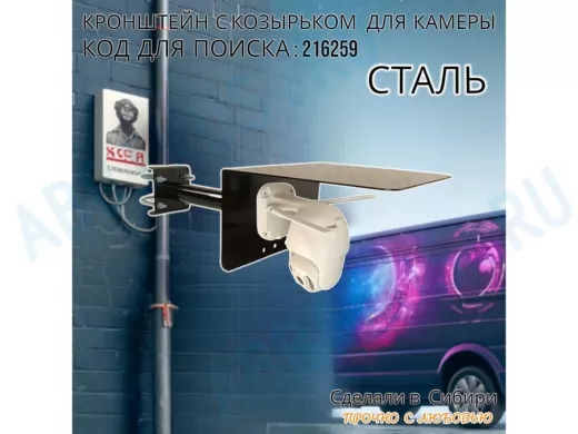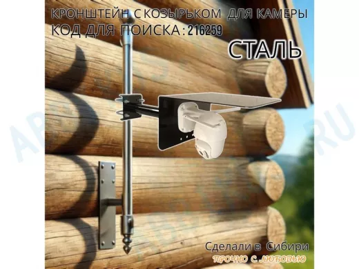 - Универсальный кронштейн с козырьком предназначен для крепления поворотной или цилиндрической камеры и прожектора на трубу.