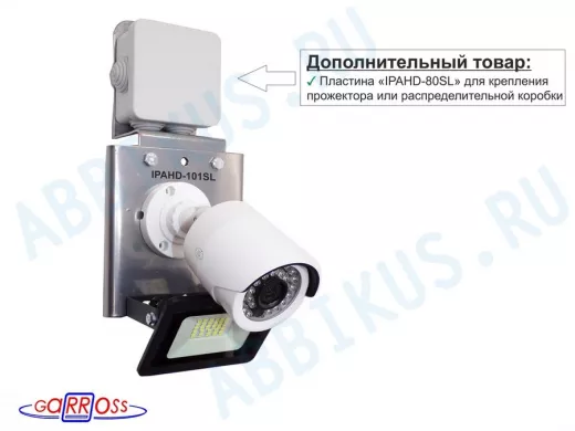 - Конструкция кронштейна позволяет крепить дополнительную опцию в виде разводной коробки, для укладки соединительных электропроводов от камеры и прожектора.