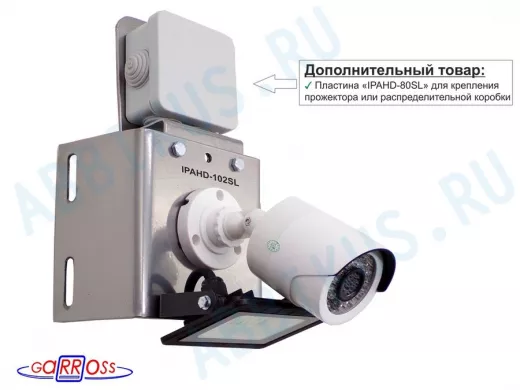 - Конструкция кронштейна позволяет крепить дополнительную опцию в виде разводной коробки, для укладки соединительных электропроводов от камеры и прожектора.