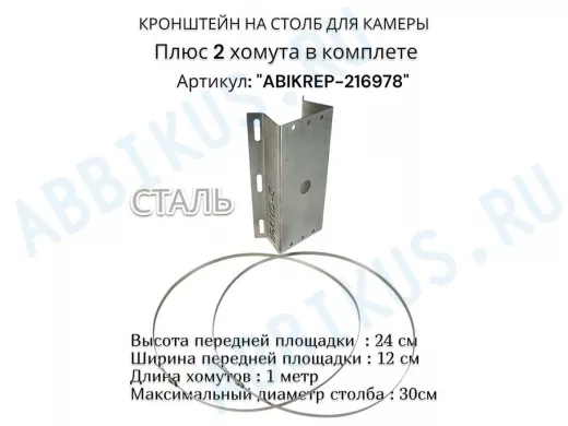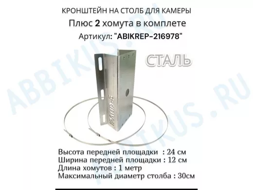 Кронштейн оцинкованный для камеры видеонаблюдения с двумя хомутами на столб "ABIKREP-216978" 24х12см