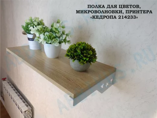 Полка предназначена для гостиной (можно разместить цветы, сувениры, фотографии), для коридора (под ключи, шапки, шарфы и перчатки), для детской (под рисунки, поделки, книги), для кухни (под микроволновку, чайник, посуду) и др.