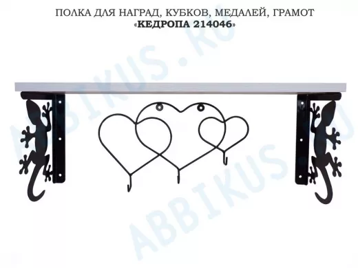 Заказать звонокПолка для наград, кубков, медалей, грамот "КЕДРОПА-214046 гекон"размер 15х60х24 см, сосна с сердцами