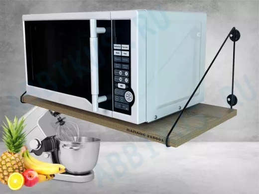 - Полка надежно крепится к стене при помощи анкеров или шурупов с дюбелями, на ней можно разместить микроволновую печь, кухонную технику, посуду, специи