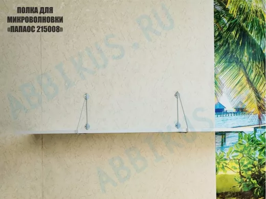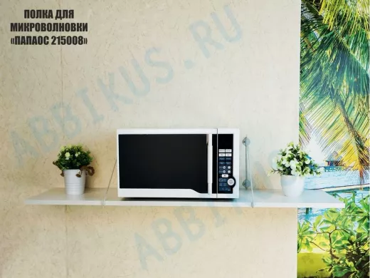 - Полка надежно крепится к стене при помощи анкеров или шурупов с дюбелями, на ней можно разместить микроволновую печь, кухонную технику, посуду, специи