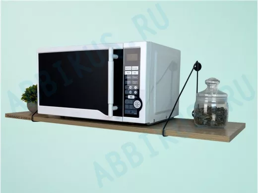 - Полка надежно крепится к стене при помощи анкеров или шурупов с дюбелями, на ней можно разместить микроволновую печь, кухонную технику, посуду, специи