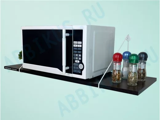 - Полка надежно крепится к стене при помощи анкеров или шурупов с дюбелями, на ней можно разместить микроволновую печь, кухонную технику, посуду, специи