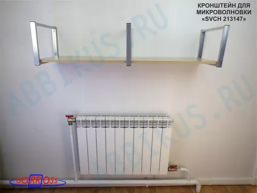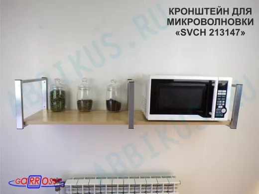 - Полка надежно крепится к стене при помощи анкеров или шурупов с дюбелями, на ней можно разместить микроволнрвую печь, кухонную технику, посуду, специи