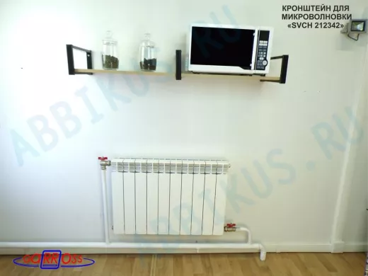 - Полка надежно крепится к стене при помощи анкеров или шурупов с дюбелями, на ней можно разместить микроволнрвую печь, кухонную технику, посуду, специи