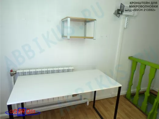 - Полка надежно крепится к стене при помощи шурупов с дюбелями, на ней можно разместить микроволновую печь, тостер, кофемашину, чайник, посуду, специи