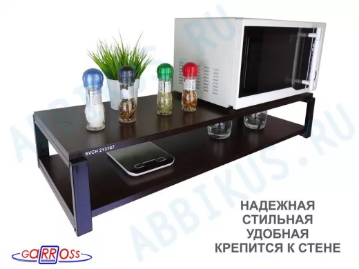 - Полка надежно крепится к стене при помощи анкеров или шурупов с дюбелями, на ней можно разместить микроволнрвую печь, кухонную технику, посуду, специи
