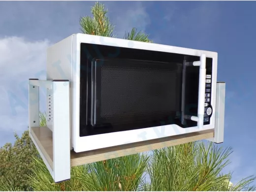 - Полка надежно крепится к стене при помощи анкеров или шурупов с дюбелями, на ней можно разместить микроволновую печь, кухонную технику, посуду, специи