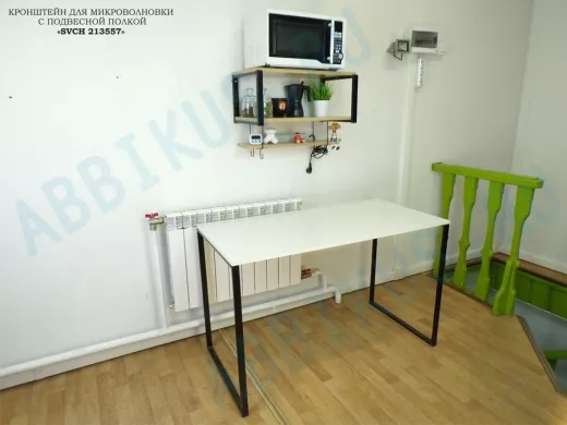 - Полка надежно крепится к стене при помощи анкеров или шурупов с дюбелями, на ней можно разместить микроволновую печь, кофемашину, тостер идр.кухонную технику, посуду, специи, различные необходимые мелочи