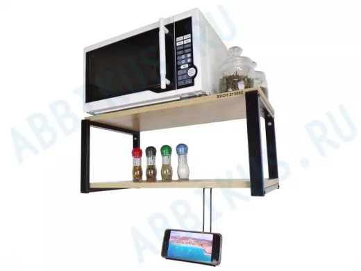 - Полка надежно крепится к стене при помощи анкеров или шурупов с дюбелями, на ней можно разместить микроволновую печь, кофемашину, тостер идр.кухонную технику, посуду, специи, различные необходимые мелочи