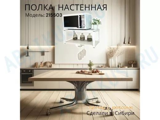 - Полка надежно крепится к стене при помощи анкеров или шурупов с дюбелями, на ней можно разместить микроволновую печь, кухонную технику, посуду, специи