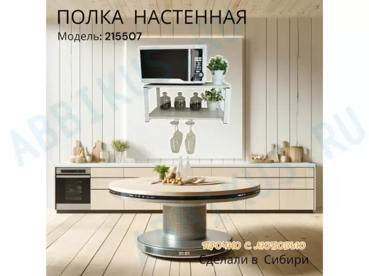 - Полка надежно крепится к стене при помощи анкеров или шурупов с дюбелями, на ней можно разместить микроволновую печь, кухонную технику, посуду, специи