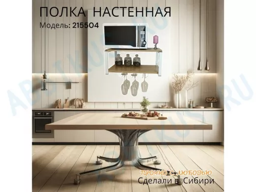 Полка надежно крепится к стене при помощи анкеров или шурупов с дюбелями, на ней можно разместить микроволновую печь, кухонную технику, посуду, специи
